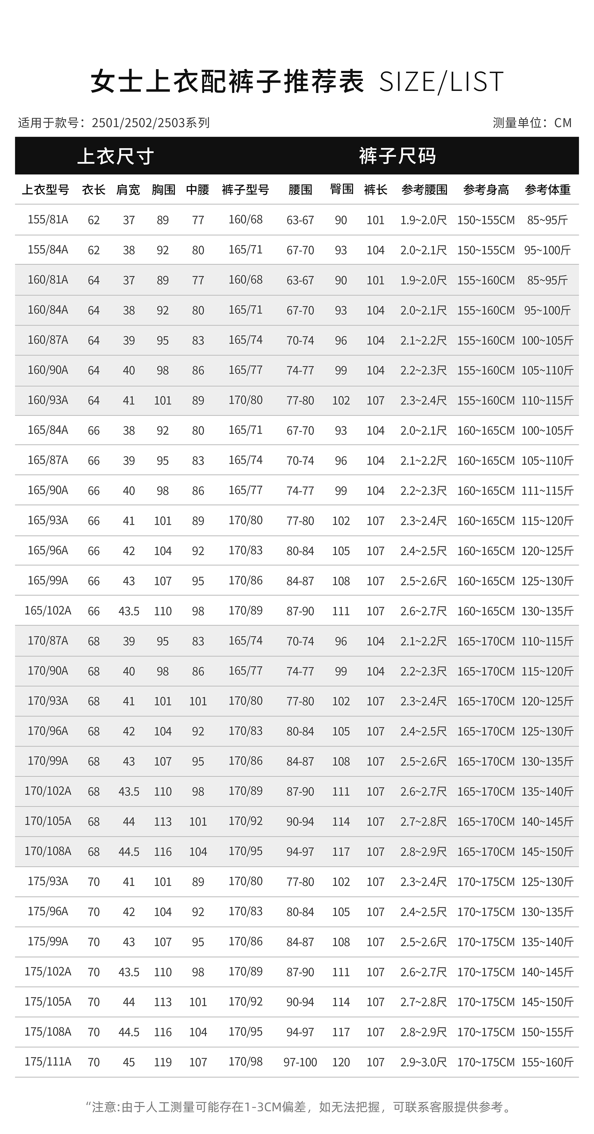 上衣27个尺码/裤子11个尺码